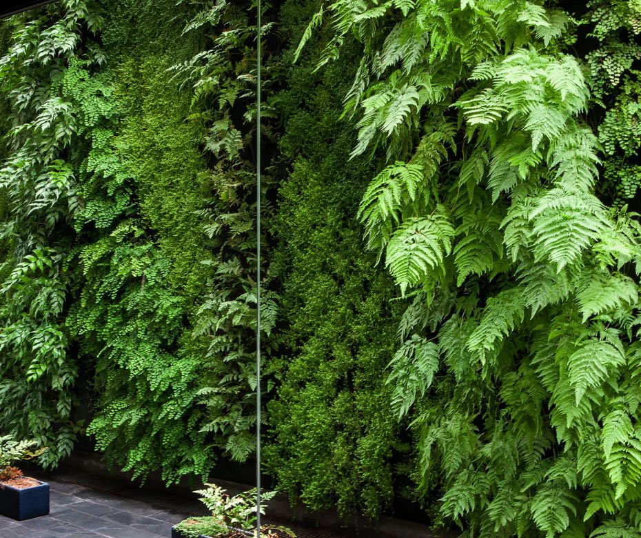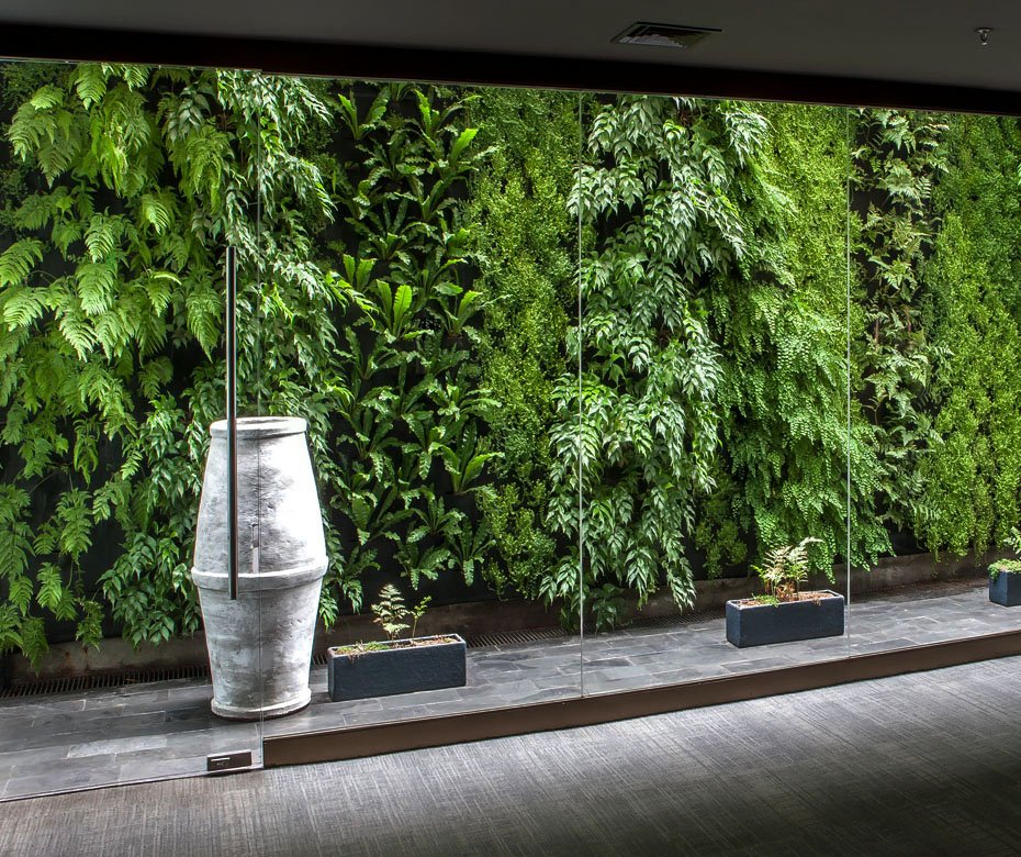 En este hotel en providencia desarrollamos un proyecto de doble altura que permite enverdecer completamente el patio inglés que da luz natural a los salones del piso –1, así como telón de fondo del counter de recepción del hotel. Es una recepción en verde a todos los pasajeros que llegan al Hotel y una forma de traer el Sur de nuestro país a Santiago.